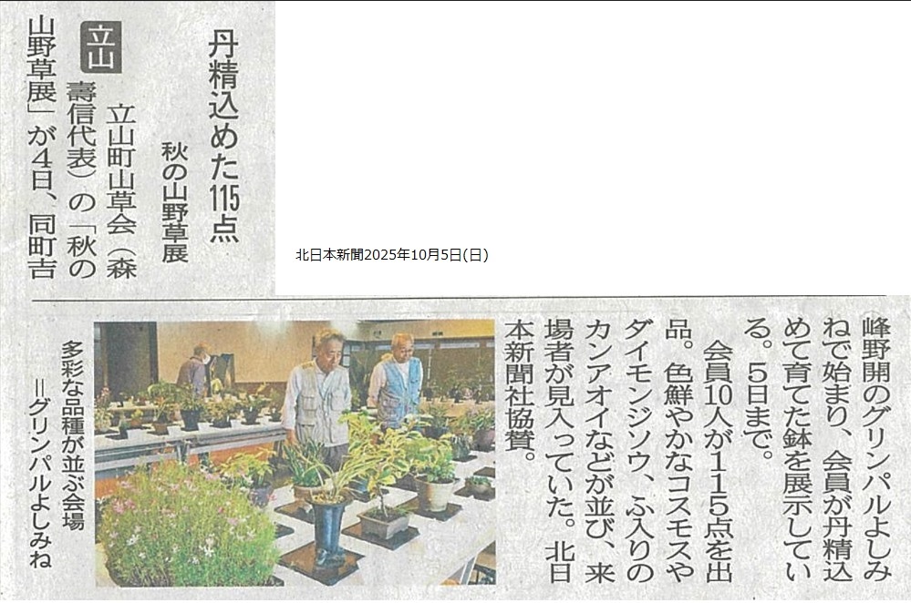 立山町山草会の「秋の山野草展」が10月4日(土)からグリンパルよしみねで始まり、会員が丹精込めて育てた鉢を展示している。10月5日(日)まで。