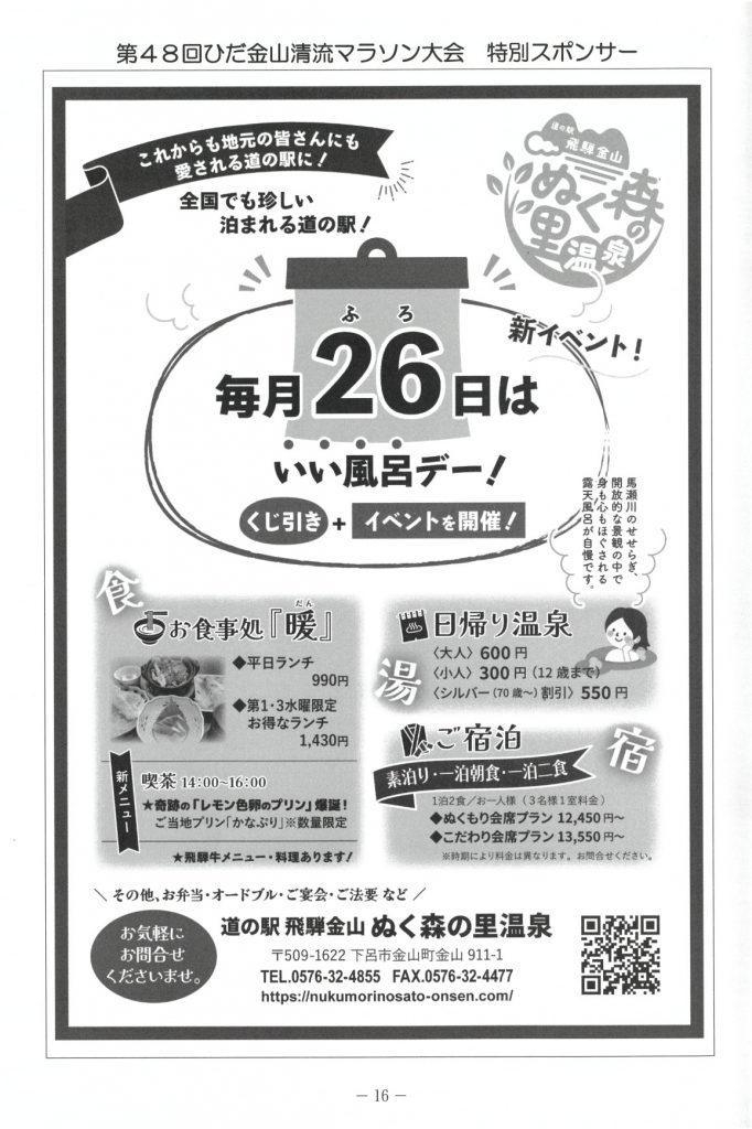 道の駅 飛騨金山ぬく森の里温泉も特別スポンサーとして応援しました。