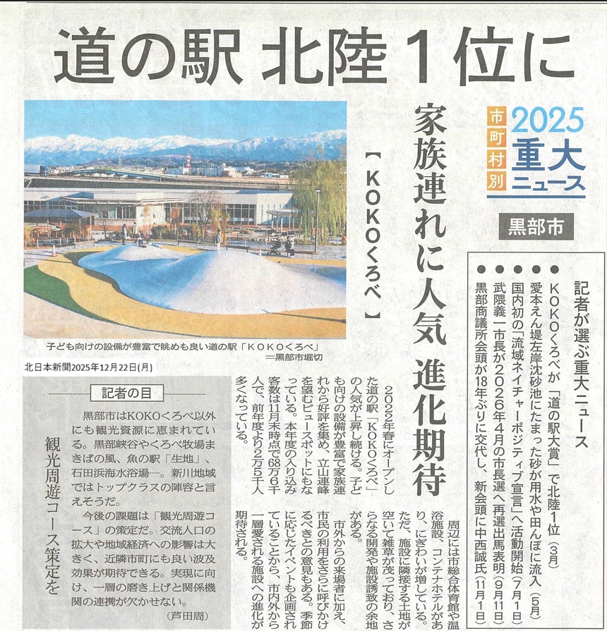「道の駅KOKOくろべの道の駅大賞北陸1位」が2025年の北日本新聞市町村別重大ニュースに選ばれました。