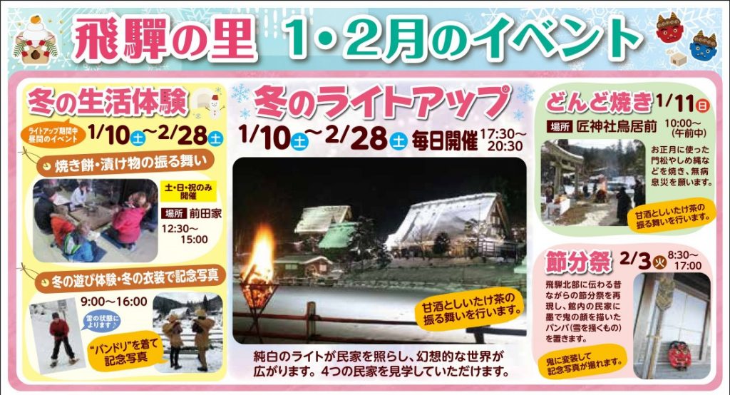 飛騨の里では、冬ならではのイベントを開催いたします。 「冬の生活体験」や「冬のライトアップ」を通して、雪景色に映える幻想的な原風景をお楽しみいただけます。 この冬はぜひ、飛騨の里で季節の行事をご体感ください。