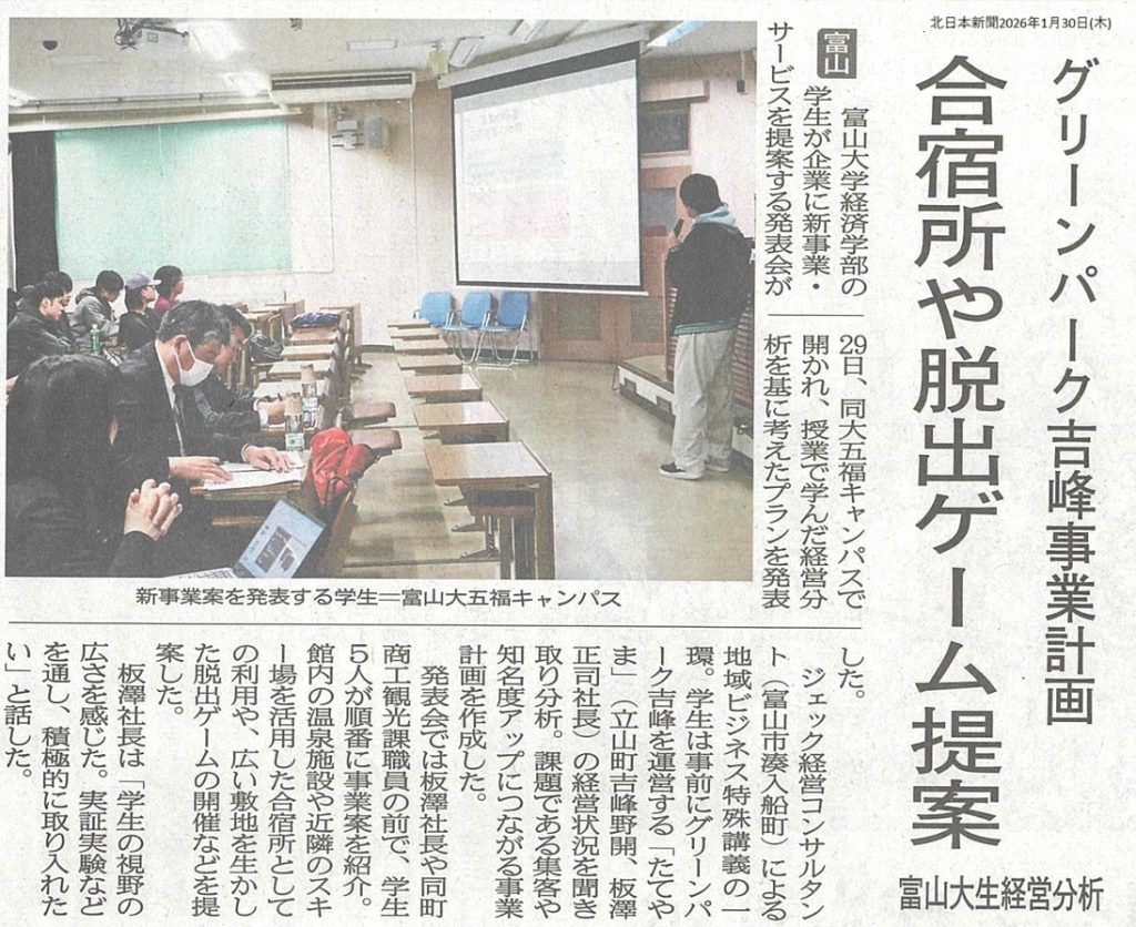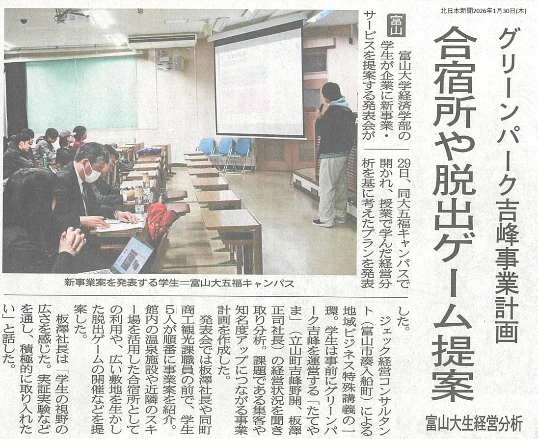 富山大学経済学部で弊社が開講する地域ビジネス特殊講義の一環として「グリーンパーク吉峰」事業計画の発表会が、1月29日(木)に同大五福キャンパスで開かれました。