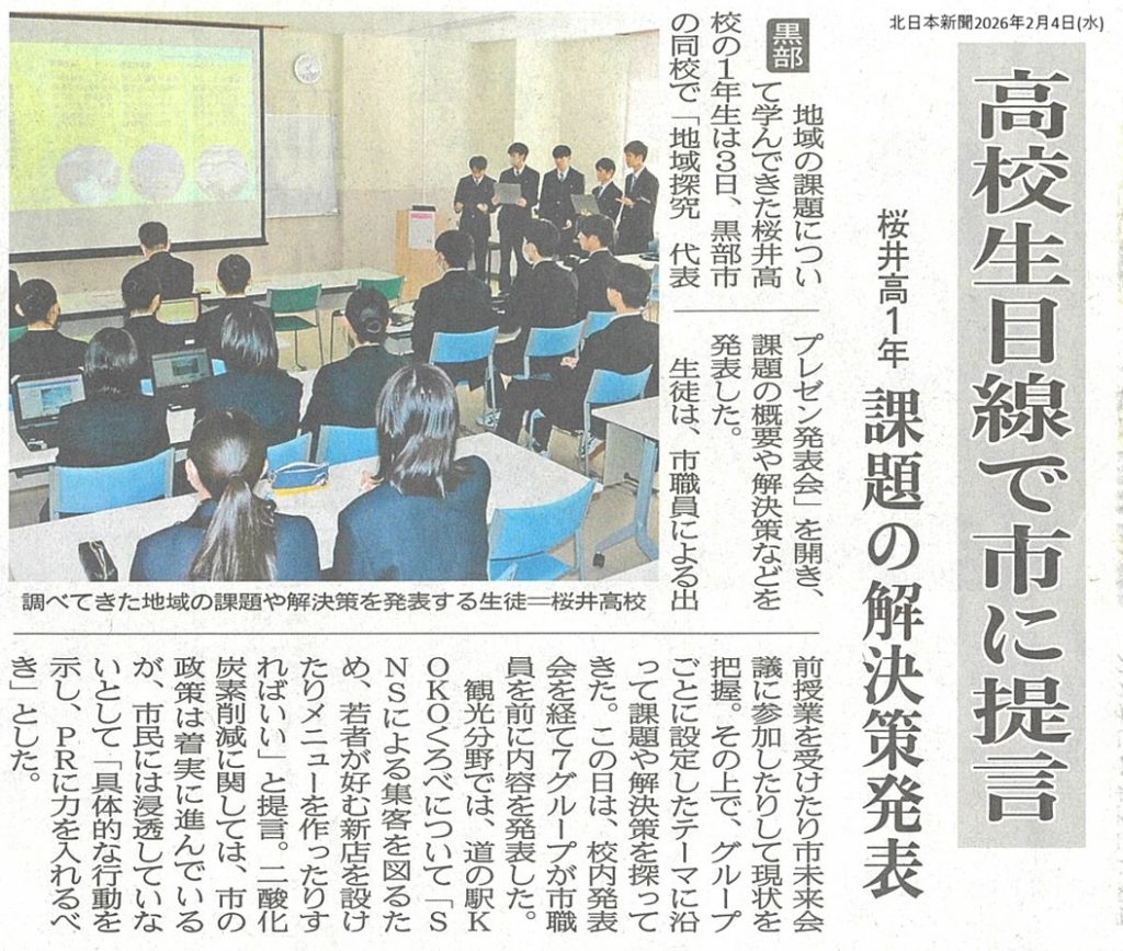黒部市の桜井高校1年生が、3日に「地域探求 代表プレゼン発表会」を開催し、地域の課題の概要や解決策などを発表しました。
