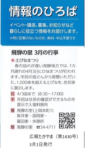 飛騨地方では、ひと月遅れでひな祭りを祝う習慣が残ることから、この「土びなまつり」は4月3日まで行われます。