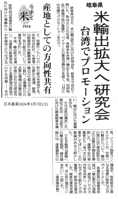 弊社第一事業部では、岐阜県が開催した米の輸出拡大に向けた研究会で、台湾への輸出における届け出や産地証明などの必要な手続きを解説し、連携予定の事業者からの意見などを共有しました。