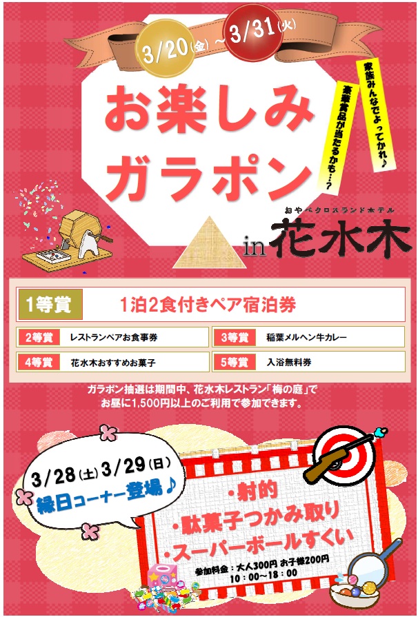 おやべクロスランドホテル 花水木では春のイベントとして「お楽しみガラポン in 花水木」を開催いたします。