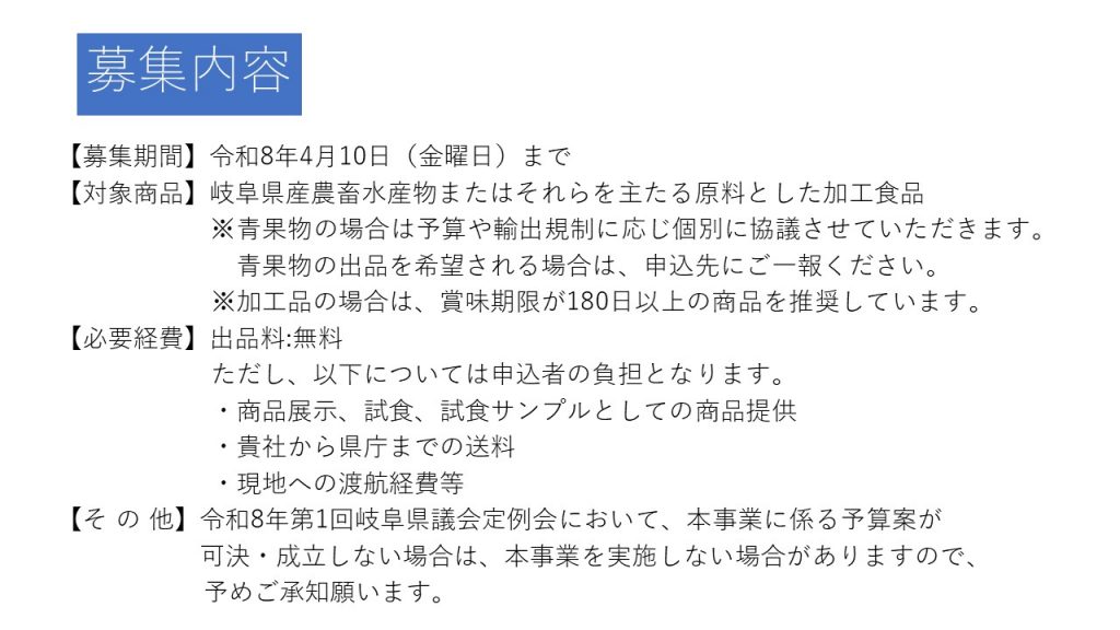 弊社が出展関連業務を受託しております「FOOD TAIPEI2026 岐阜県ブース」の出展者募集が岐阜県様WEBサイトにて公開されました。