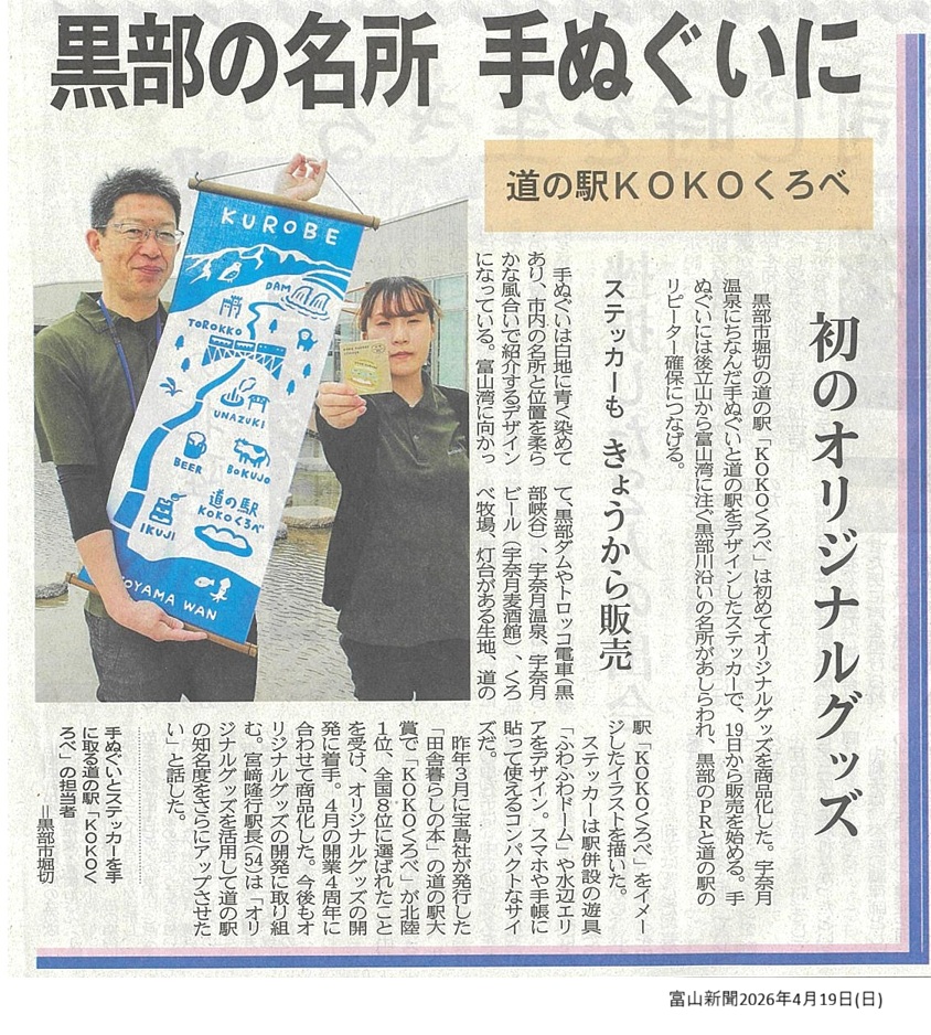 宇奈月温泉にちなんだ手ぬぐいと、道の駅をデザインしたステッカーを開業4周年に合わせて商品化、19日(日)から道の駅内の「こられっと」にて販売しています。