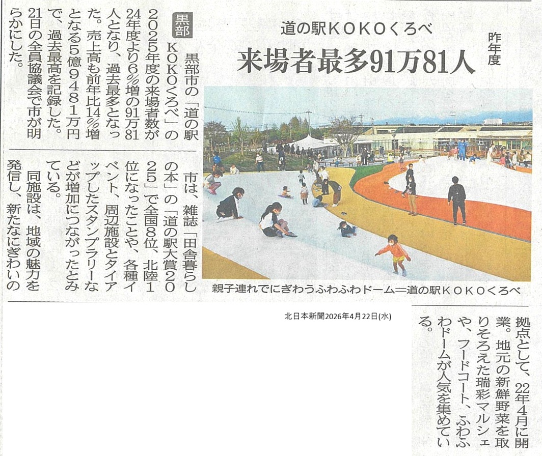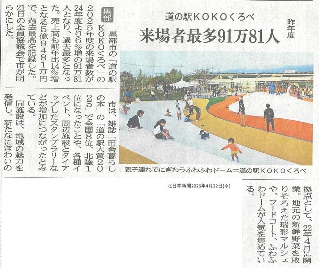 道の駅KOKOくろべの2025年度来場者数は、24年度より6%増の91万81人となり過去最多となりました。