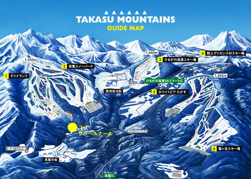 西日本最大級のスノーリゾートエリアTAKASU MOUNTAINSの中心地、ダイナランドスキー場の登り口に位置する